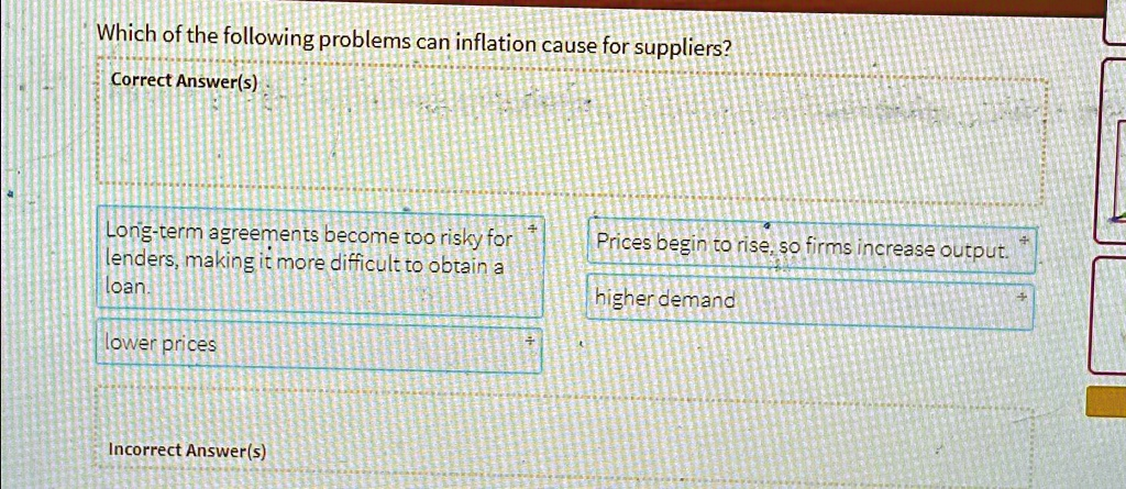 Which of the following problems can inflation cause for suppliers? Correct Answer(s) Long-term agreements become too risky for lenders, making it more difficult to obtain a loan. lower prices Incorrect Answer(s) Prices begin to rise, so firms increase output. higher demand