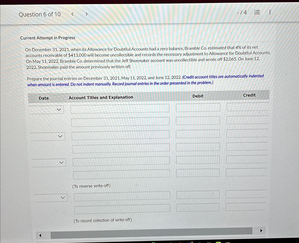 The first entry records the estimated bad debt expense for the year. Bramble Co. uses the percentage of receivables method. The calculation is 4% of the $413,000 accounts receivable, which equals
