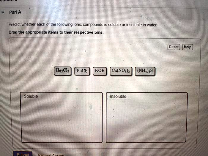Predict whether each of the following ionic compounds is soluble or insoluble in water: Drag the appropriate items to their respective bins. HgCl2 PbCl2 KOH Ca(NO3)2 (NH4)2S Soluble Insoluble