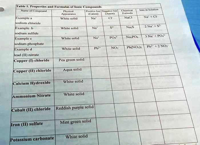 | Example c<br>sodium phosphate | White solid | Na⁺ | PO₄³⁻ | Na₃PO₄ | 3 Na⁺ + PO₄³⁻ |