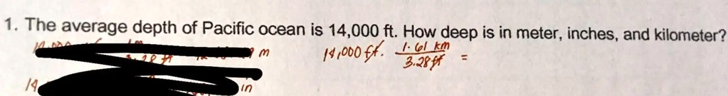 The average depth of the Pacific Ocean, 14,000 feet, can be converted to other units as follows: