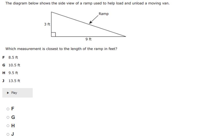 The value 9.487 ft is closest to 9.5 ft. Thus, option H is the correct answer