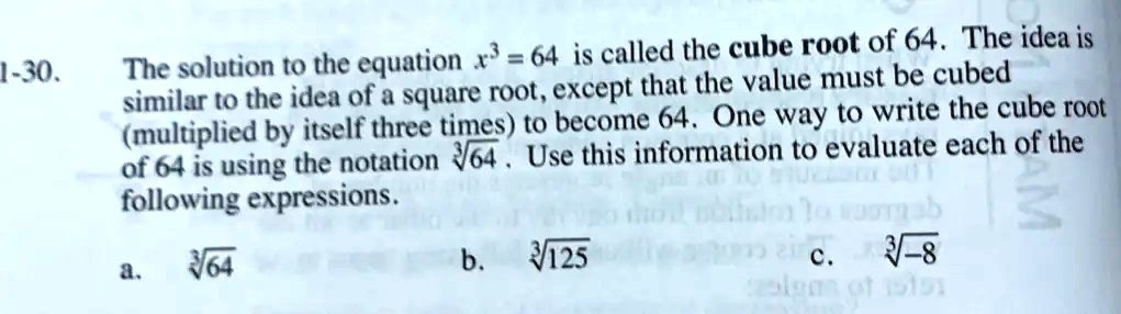 The problem asks us to evaluate several cube roots based on the provided definition. A cube root of a number is a special value that, when multiplied by itself three times, results in the original number. This operation is the inverse of cubing a number. For example, the solution to the equation x³ = 64 is the cube root of 64. We will apply this principle to solve each part of the question.