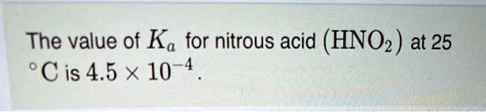 Based on the information provided, the acid dissociation constant, or Kₐ, for nitrous acid (HNO₂) at 25 °C is 4.5 × 10⁻⁴. This value is a quantitative measure of the strength of an acid in solution.