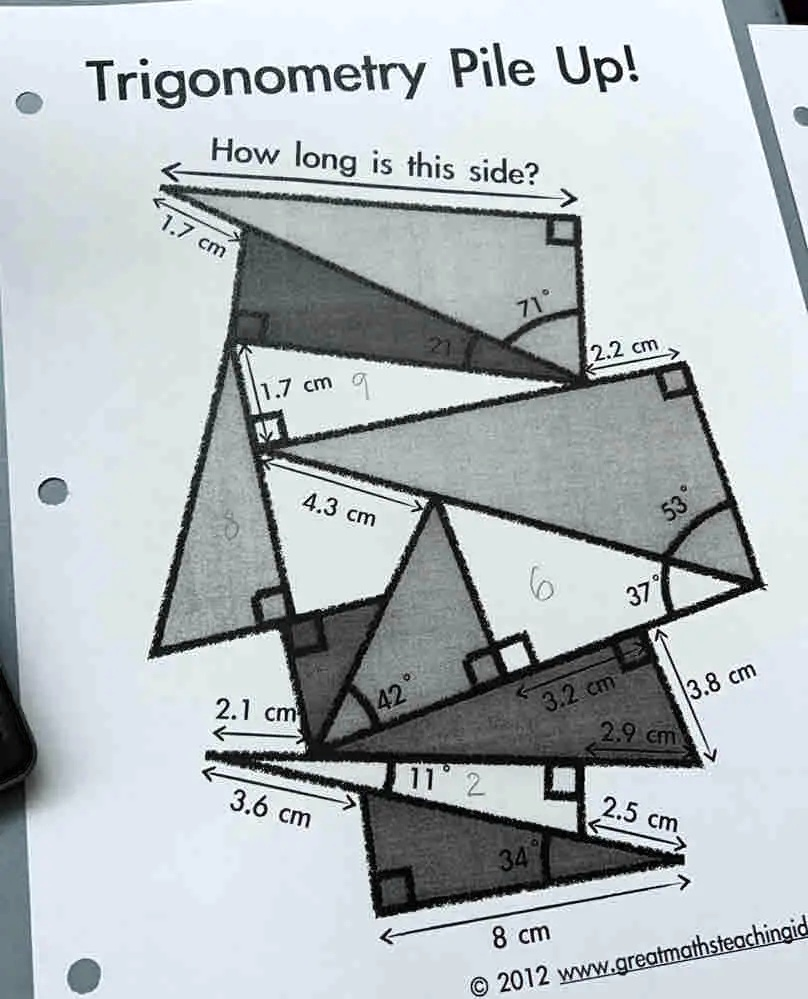 Trigonometry Pile Up! How long is this side? 1.7 cm 1.7 cm 9 4.3 cm 21 71° 2.2 cm 53° 2.1 cm 3.6 cm 6 37° 42° 3.2 cm 11° 2 34° 8 cm 2.9 cm 2.5 cm 3.8 cm © 2012 www.greatmathsteachingid