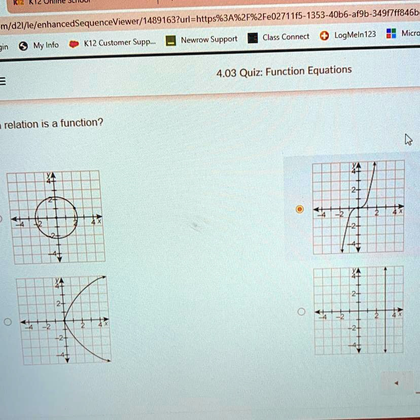 - Top Left Graph (Circle): If you draw a vertical line through any part of the circle’s interior, for example at x = 1, the line will intersect the circle at two distinct points. Since one x-value corresponds to two y-values, this relation is not a function.