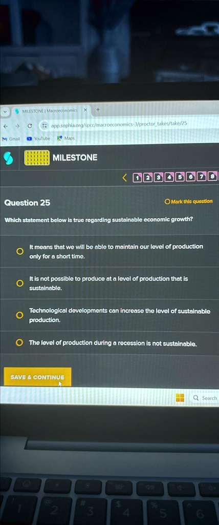 Question 25 O Mark this question Which statement below is true regarding sustainable economic growth? It means that we will be able to maintain our level of production only for a short time. It is not possible to produce at a level of production that is sustainable. Technological developments can increase the level of sustainable production. The level of production during a recession is not sustainable