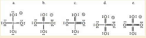 By forming three double bonds and leaving one single bond, as shown in structure d, we achieve the most stable distribution of formal charges. In this structure, the three double bonded oxygen atoms have a formal charge of 0. The one singly bonded oxygen atom has a formal charge of -1. The central iodine atom, now with seven bonds (three double, one single), has a formal charge of 0. This arrangement successfully minimizes formal charges and places the required overall -1 charge on one of the highly electronegative oxygen atoms, which is the most favorable location. Structures like ‘c’ and ‘e’ are less stable because they either have higher formal charges or place a negative charge on the less electronegative iodine atom.