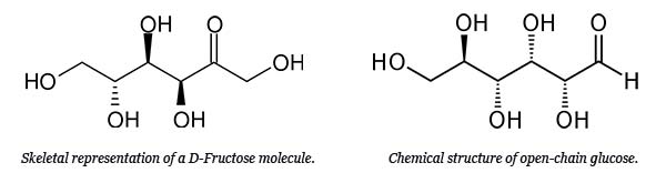 Chemical formula and image of glucose and fructose molecule that forms the high fructose corn syrup