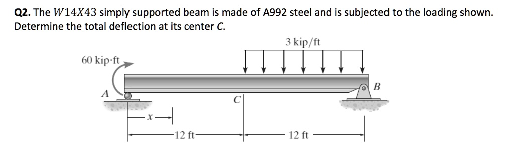 The W14X43 simply supported beam is made of A992 steel and is subjected to the loading shown. Determine the total deflection at its center C. 60 kip\text{-}ft 3 kip/ft A 12 ft C 12 ft B