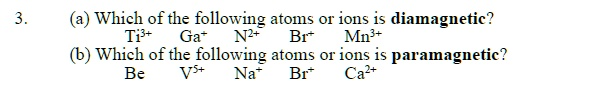 - Ga⁺: Gallium (Ga, Z=31) is [Ar] 4s² 3d¹⁰ 4p¹. The Ga⁺ ion loses its single 4p electron, resulting in the configuration [Ar] 4s² 3d¹⁰. Both the 4s and 3d subshells are completely filled. With no unpaired electrons, Ga⁺ is diamagnetic.