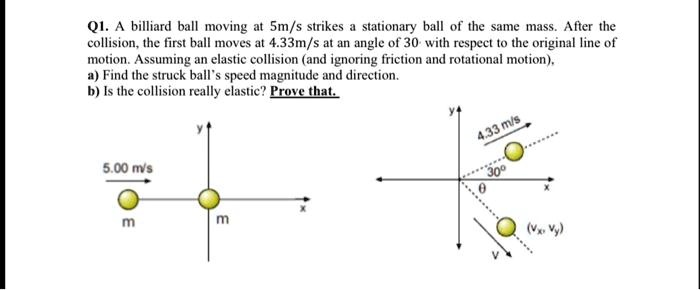 A billiard ball moving at 5m/s strikes a stationary ball of the same mass. After the collision, the first ball moves at 4.33m/s at an angle of 30 with respect to the original line of motion. Assuming an elastic collision (and ignoring friction and rotational motion), a) Find the struck ball’s speed magnitude and direction. b) Is the collision really elastic? Prove that.
