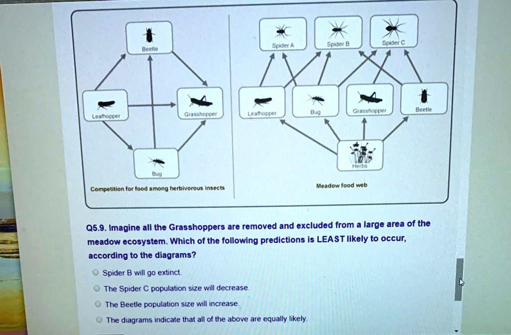 Beetle Spider A Spider B Spider C Leafhopper Grasshopper Leafhopper Bug Grasshopper Beetle Bug Competition for food among herbivorous insects Herbs Meadow food web Q5.9. Imagine all the Grasshoppers are removed and excluded from a large area of the meadow ecosystem. Which of the following predictions is LEAST likely to occur, according to the diagrams? Spider B will go extinct. The Spider C population size will decrease. The Beetle population size will increase. The diagrams indicate that all of the above are equally likely.