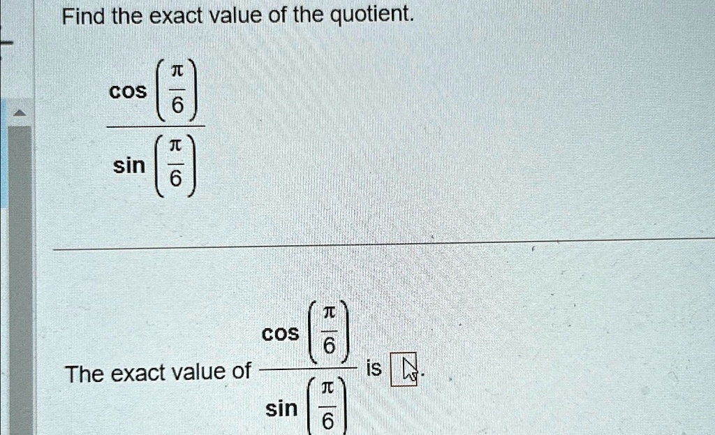 To find the exact value of the quotient cos(π/6) / sin(π/6), we can approach the problem in two ways: by using a trigonometric identity or by direct calculation of the individual values.