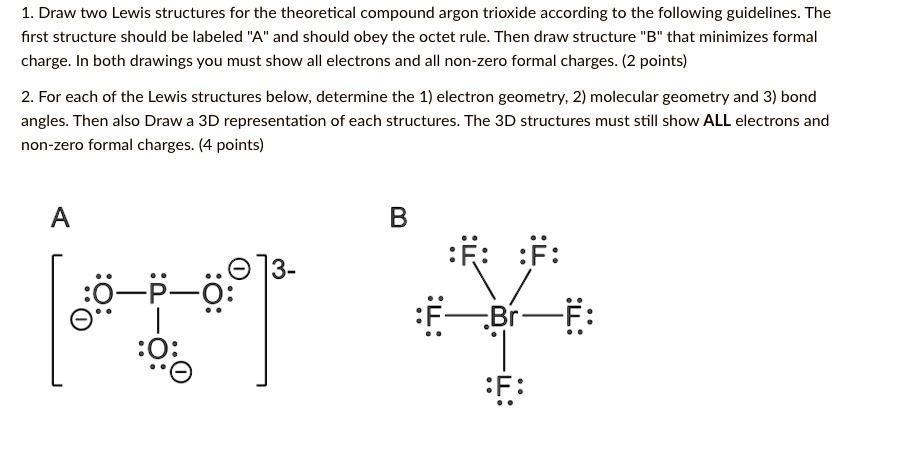 Draw two Lewis structures for the theoretical compound argon trioxide according to the following guidelines The first structure should be labeled “A” and should obey the octet rule_ Then draw structure B” that minimizes formal charge In both drawings you must show all electrons and all non-zero formal charges. (2 points) For each of the Lewis structures below, determine the 1) electron geometry; 2) molecular geometry and 3) bond angles: Then also Draw 3D representation of each structures. The 3D structures must still show ALL electrons and non-zero formal charges. (4 points) B R: :F: 73- ~F_&: E~Br