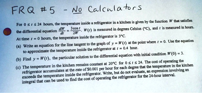 This problem involves analyzing a differential equation that models the temperature inside a refrigerator. The solution requires applying calculus techniques for tangent line approximation, solving differential equations, and setting up a definite integral for a real world application.