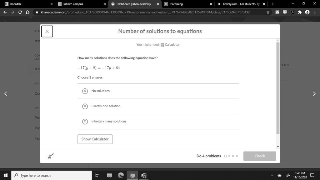 Choose 1 answer: A No solutions B Exactly one solution C Infinitely many solutions Show Calculator Do 4 problems Check