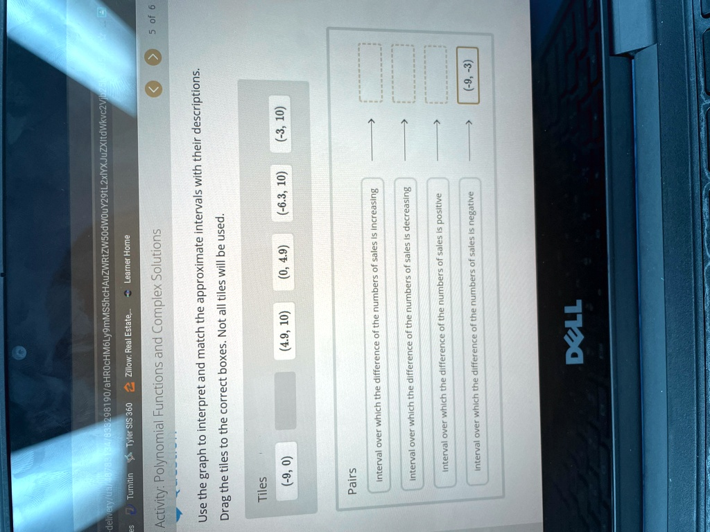 Polynomial Functions and Complex Solutions Use the graph to interpret and match the approximate intervals with their descriptions. Drag the tiles to the correct boxes. Not all tiles will be used. Tiles (-9, 0) (4.9, 10) (0, 4.9) (-6.3, 10) (-3, 10) Pairs Interval over which the difference of the numbers of sales is increasing Interval over which the difference of the numbers of sales is decreasing Interval over which the difference of the numbers of sales is positive Interval over which the difference of the numbers of sales is negative (-9, -3)