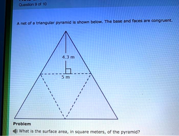 A net of a triangular pyramid is shown below. The base and faces are congruent. 4.3 m 5 m Problem What is the surface area, in square meters, of the pyramid?