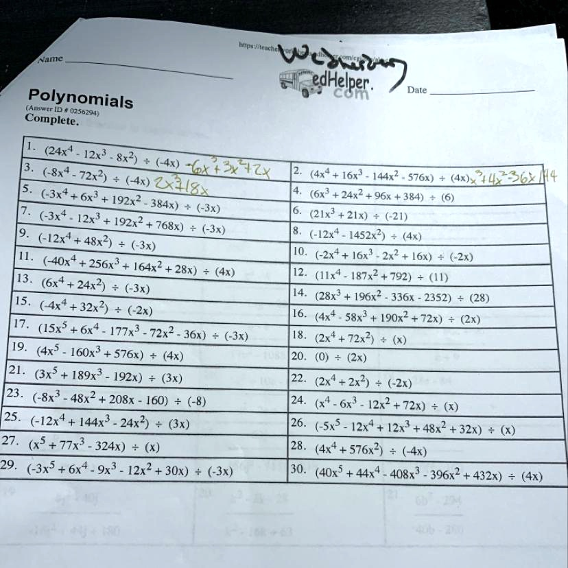 Please help me solve this!!! Vumc Polynomials (Answer ID # 02562741 Complete. huna”f eacne VcccD SedHelper; Date (24x^4 + 12x^3 + 8x^2) (4x) (-8x^4 + 72x^2) (AA4x) (4x + 16r` + 144x^2 + 576x) (Ax)y 74261 21ls (3x^2 + 6x^3 + 192x^2 + (6x^3 + 24x^2 + 96x + 384) 384x) (-3x) (-3x^4 + 12x^3 + (2Ix^3 + 21x) 192x^2 + (-21) 7681) (-x) (-12x+ (-12x^4 + 48x^2) [452x^2) (-3x) I1_ 10 (-2x^4 + 16x^8 + (40x+ + 256x^3 + 2x^2 + [6x) (-Zx) 164x^2 + 28x) 13 . (4x) (Ix^4 – 187x^2 + 792) (6x! + 24x^2) (11) (-3x) 15 . (28x’ + 196x? _ 336x 2352) + (28) (-4xt +32x^2) (-2x) 16 . (4x^4 – 58x^3 + [90x^2 + 17 72x) (2x) (ISx^5 + 6x^4 177x^3 72x^2 36x) (-3x) 18 (2x+ 72x^2) 19. (4x^5 160x^2 + 576x) (4x) 20 . (0) (2x) 121. (3x^5 + 189x^3 192x) (3x) 22 (Zx 2x^2) (~Zx) 23 (-8x^2 _ 48x^2 + 208x 160) (-8) 24 6x^3 12x^2 + 72x) 25. (-12x^4 + 144x^3 _ 24x^2) (3x) 26 . (-Sx^2 12x’ + 12x^2 + 48x^2 + 32x) (X) 27. 77x^3 324x) 28 (4x^4+ 576x^2) (-4x) 29 (-3x^5 + 6x^4 9x^2 – 12x^2 + 30x) (-3x) 30 (40x^5 + 44x^4 _ 408x^3 396x^2 + 432x) (4x)