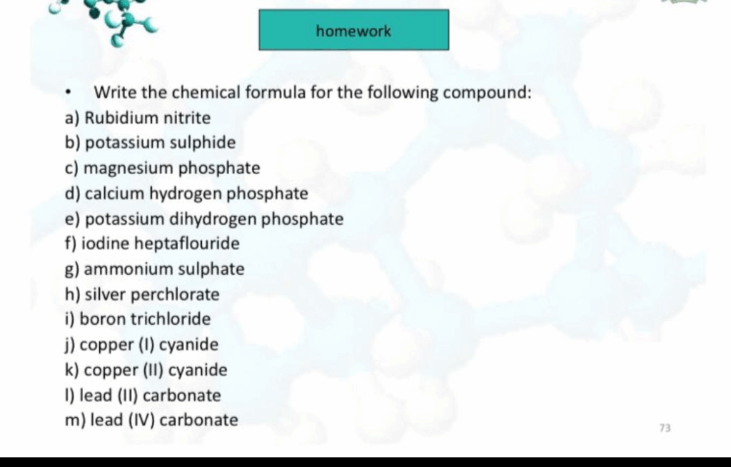 Writing the chemical formula for a compound requires understanding the rules of chemical nomenclature. The primary step is to identify whether the compound is ionic or covalent. For ionic compounds, which typically consist of a metal and a nonmetal or a polyatomic ion, the formula is determined by balancing the charges of the cation (positive ion) and the anion (negative ion) to create a neutral compound. The charge of main group elements can often be predicted from their position in the periodic table. For transition metals, the charge is usually indicated by a Roman numeral in the name. Polyatomic ions have specific, established formulas and charges that must be known.