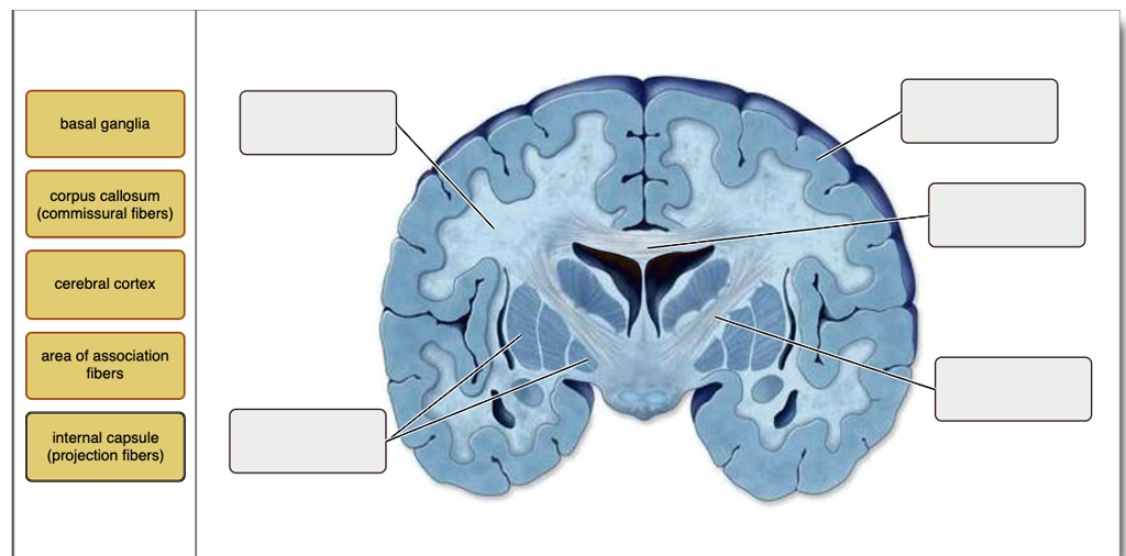 - Internal capsule (projection fibers): These are bundles of axons that carry information from the cerebral cortex to other areas of the central nervous system. Projection fibers link the cortex with lower brain centers and the spinal cord. In the image, they appear as a white band running between the basal ganglia and the thalamus.