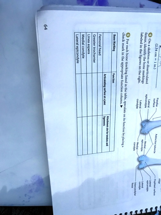 2.54 cm = 1 in.) 4 On a skeleton or disarticulated femur, identify the bone markings labeled in the figures on the right. ? For each bone marking listed in the table, speculate on its function by placing a check mark in the appropriate function column. Bone Marking Function Articulating surface at a joint Attachment site for tendons and ligaments Femoral head Greater trochanter Linea aspera Medial condyle Lateral epicondyle