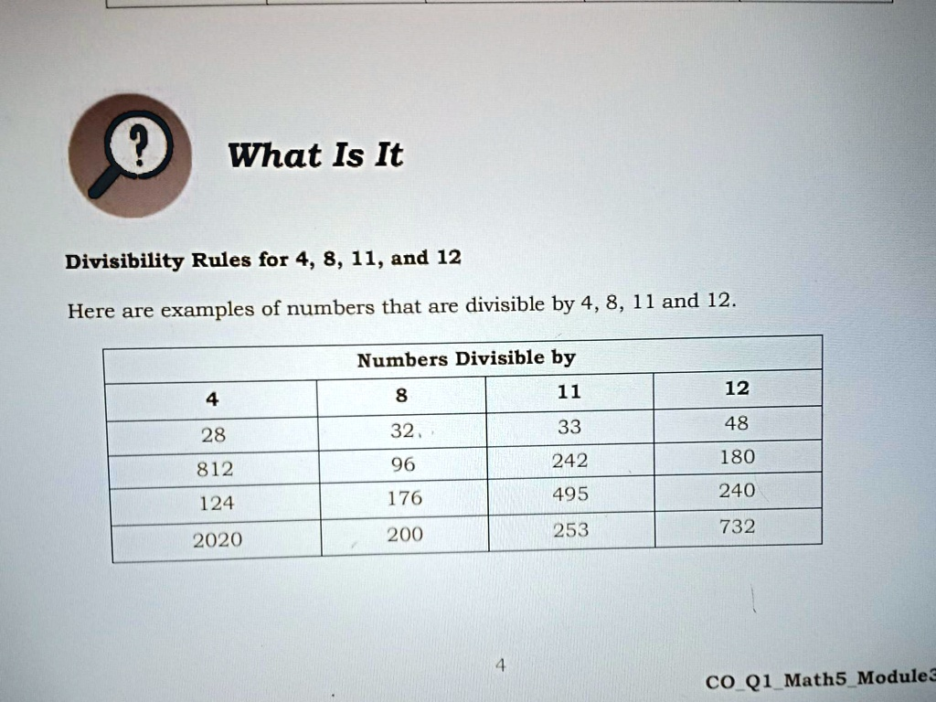 What Is It Divisibility Rules for 4, 8, 11, and 12 Here are examples of numbers that are divisible by 4, 8, 11 and 12. Numbers Divisible by 4 8 11 12 28 32 33 48 812 96 242 180 124 176 495 240 2020 200 253 732