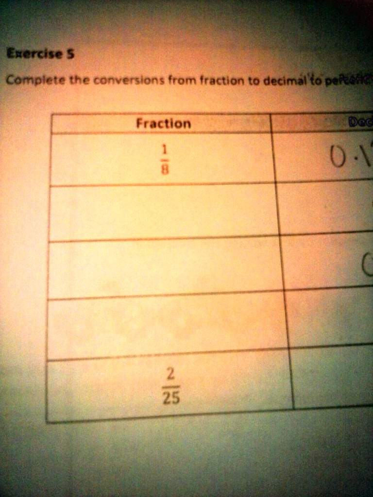 Complete the conversions from fraction to decimal to percent Fraction 1/8, 2/25,