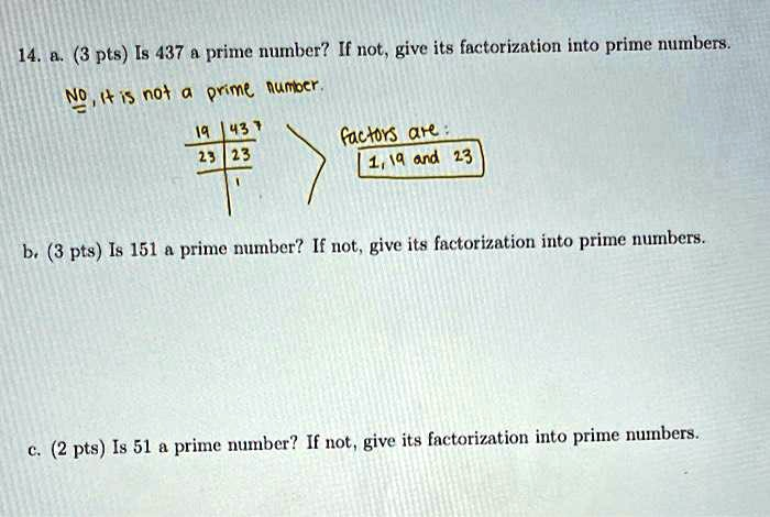 Is 437 a prime number? If not, give its factorization into prime numbers. Not a prime number. The factors of 437 are 1, 19, and 23. (3 pts) Is 151 a prime number? If not, give its factorization into prime numbers. Prime number. (2 pts) Is 51 a prime number? If not, give its factorization into prime numbers. Not a prime number. The factors of 51 are 1, 3, 17, and 51.