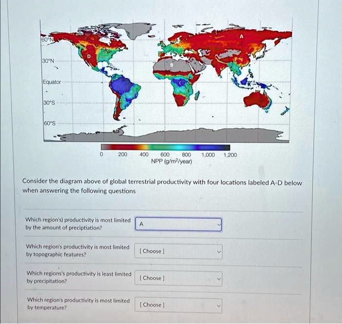 60°N 30°N Equator 30°S 60°S D 0 200 400 600 800 1,000 1,200 NPP (g/m²/year) A Consider the diagram above of global terrestrial productivity with four locations labeled A-D below when answering the following questions Which region’s) productivity is most limited by the amount of preciptiation? A Which region’s productivity is most limited by topographic features? [Choose] Which regions’s productivity is least limited by precipitation? [Choose] Which region’s productivity is most limited by temperature? [Choose]