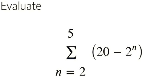 The problem asks to evaluate the summation, represented by the Greek letter sigma (Σ). The expression is the sum of the terms (20 – 2^n) for integer values of n starting from 2 and ending at 5. To solve this, we will substitute each value of n (2, 3, 4, and 5) into the expression, calculate the result for each term, and then add all of these results together.