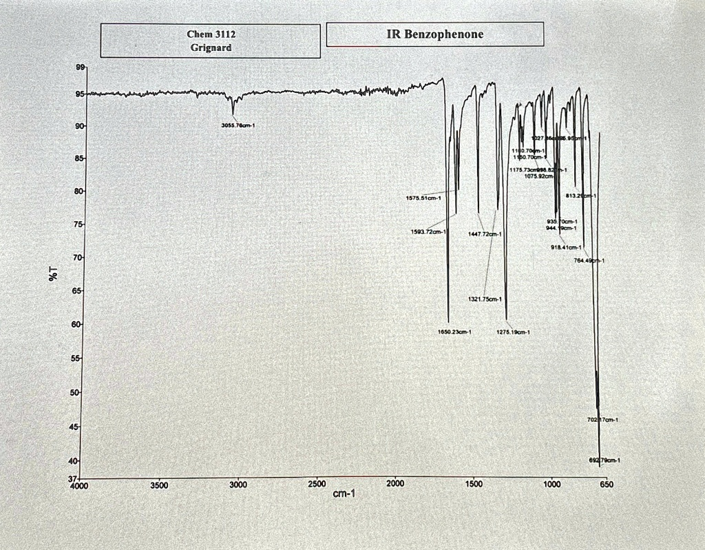 Fully annotate the IR spectra for benzophenone. Chem 3112 Grignard IR Benzophenone $6 90 85 175.7 1075.92CT 80 1575.51cm- 75 93 1593.72cm 1447.72cm 70 764 0% 65 1321.75cm 60 1650.23cm-1 1275.19cm-1 55 50 45 7027cm 40 3500 3000 2500 cm-1 2000 1500 1000 650