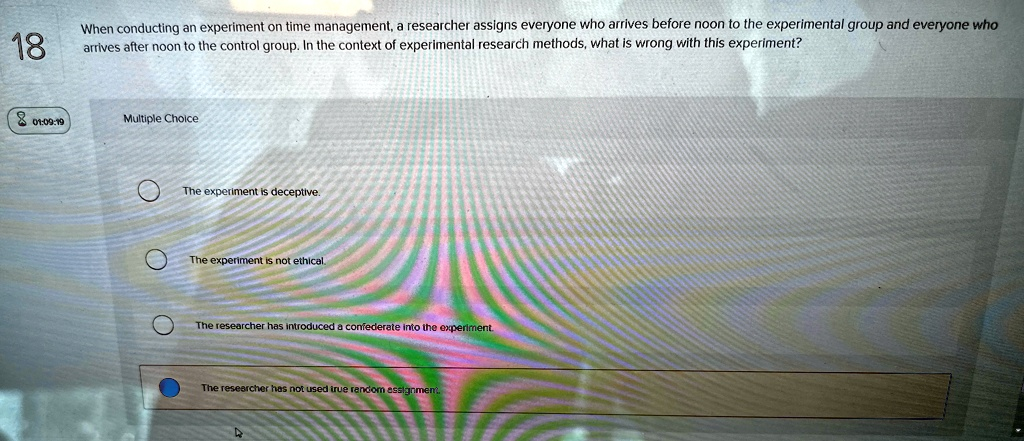 When conducting an experiment on time management, a researcher assigns everyone who arrives before noon to the experimental group and everyone who arrives after noon to the control group. In the context of experimental research methods, what is wrong with this experiment? Multiple Choice The experiment is deceptive. The experiment is not ethical. The researcher has introduced a confederate into the experiment. The researcher has not used true random assignment.