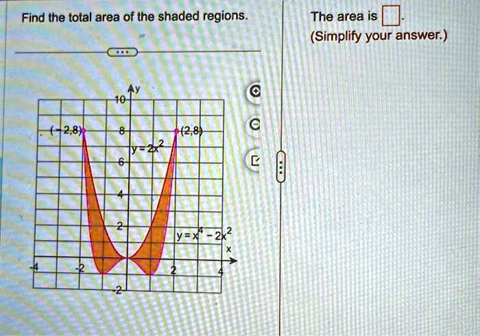 Find the total area of the shaded regions. Ay 10 (-2,8) 8 (2,8) y = 2x^2 6 4 2 y = x^4 – 2x^2 -4 -2 2 4 -2 The area is (Simplify your answer.)
