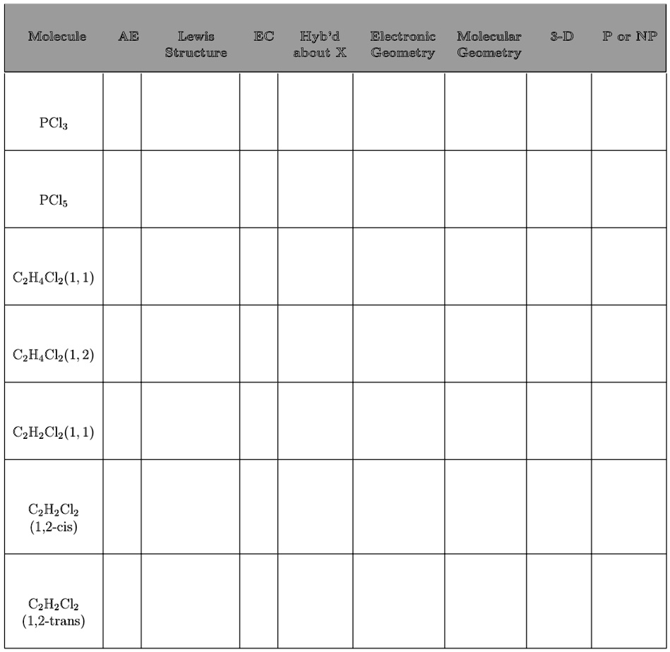 Molecule AE Lewis Structure EC Hyb’d about X Electronic Geometry Molecular Geometry 3-D P or NP PC13 PC15 C2H4Cl2(1, 1) C2H4Cl2(1, 2) C2H2Cl2(1,1) C2H2Cl2 (1,2-cis) C2H2Cl2 (1,2-trans)