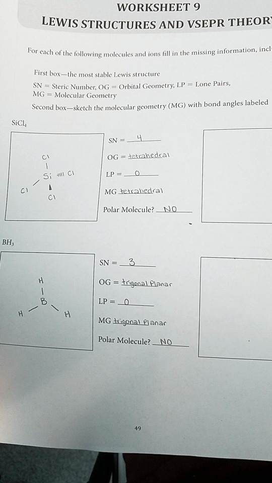 WORKSHEET 9 LEWIS STRUCTURES AND VSEPR THEORY For each of the following molecules and ions fill in the missing information, including First box—the most stable Lewis structure SN = Steric Number, OG = Orbital Geometry, LP = Lone Pairs, MG = Molecular Geometry Second box—sketch the molecular geometry (MG) with bond angles labeled SiCl