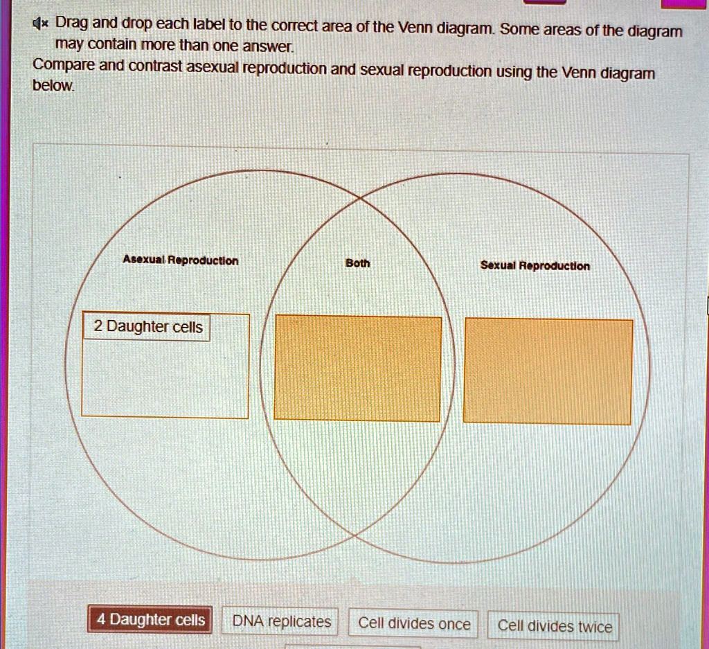 Drag and drop each label to the correct area of the Venn diagram. Some areas of the diagram may contain more than one answer. Compare and contrast asexual reproduction and sexual reproduction using the Venn diagram below. Asexual Reproduction Both Sexual Reproduction 2 Daughter cells 4 Daughter cells DNA replicates Cell divides once Cell divides twice