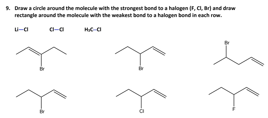 . Draw a circle around the molecule with the strongest bond to a halogen (F, Cl, Br) and draw rectangle around the molecule with the weakest bond to a halogen bond in each row. Li\text{-}Cl Cl\text{-}Cl H_3C\text{-}Cl