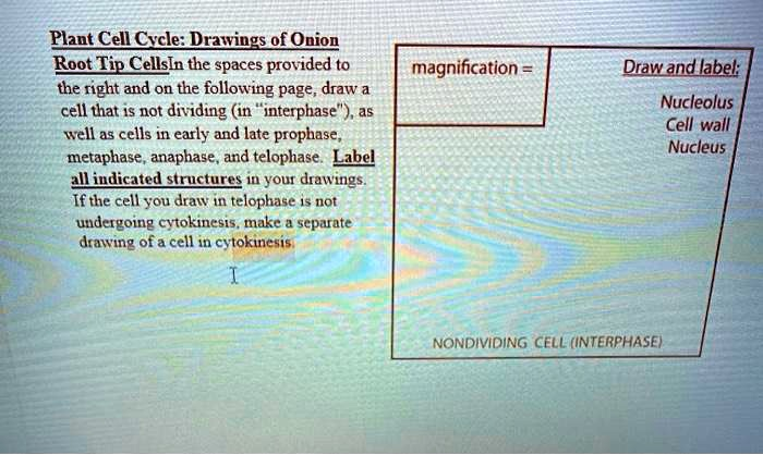 Plant Cell Cycle: Drawings of Onion Root Tip Cells In the spaces provided to the right and on the following page, draw cells that are not dividing (in interphase), as well as cells in early and late prophase, metaphase, anaphase, and telophase. Label the indicated structures in your drawings. If the cell you draw in telophase is not undergoing cytokinesis, make a separate drawing of a cell in cytokinesis. Magnification: Draw and label: Nucleolus, Cell wall, Nucleus NONDIVIDING CELL (INTERPHASE)