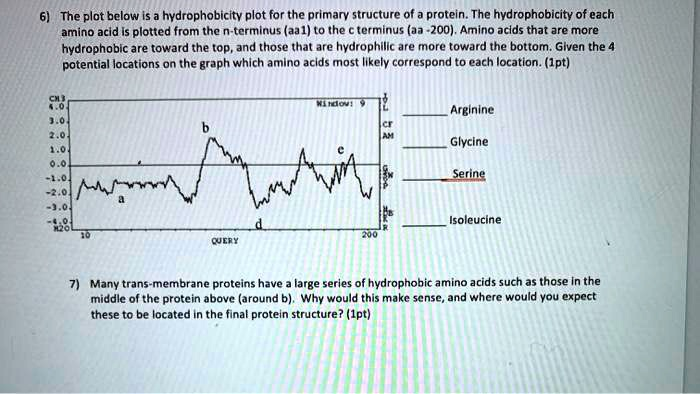 The plot below is a hydrophobicity plot for the primary structure of a protein. The hydrophobicity of each amino acid is plotted from the N-terminus (aa1) to the C-terminus (aa2001). Amino acids that are more hydrophobic are towards the top, and those that are hydrophilic are towards the bottom. Given the potential locations on the graph, which amino acids most likely correspond to each location? (1pt) Arginine Glycine Serine Alanine Isoleucine Tyrosine Many transmembrane proteins have large series of hydrophobic amino acids, such as those in the middle of the protein above (around b). Why would this make sense, and where would you expect these to be located in the final protein structure? (1pt)