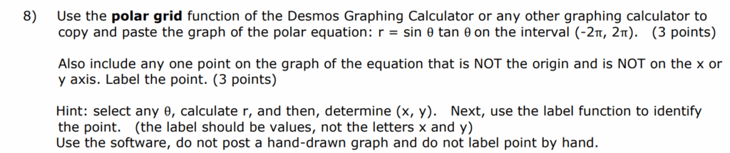 ![Desmos graph of the polar equation r = sin(θ)tan(θ (0.5, 0.5), using the graphing software’s labeling function as specified in the instructions.) on a polar grid. The graph shows a curve known as a cissoid of Diocles, with two lobes symmetric about the y-axis, approaching a vertical asymptote. A point in the first quadrant is plotted and labeled with its Cartesian coordinates (0.5, 0.5).]