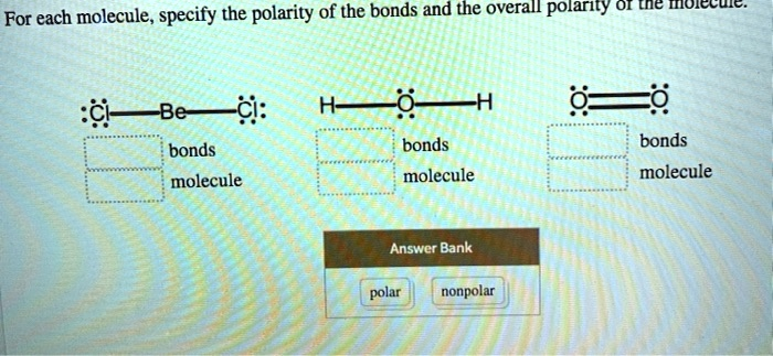 For each molecule, specify the polarity of the bonds and the overall polarity of the liquid. – BeCl2: nonpolar bonds, nonpolar molecule – O2: nonpolar bonds, nonpolar molecule – H2O: polar bonds, polar molecule Answer Bank: – polar – nonpolar