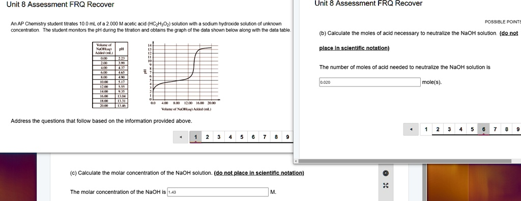 Unit 8 Assessment FRQ Recovery An AP Chemistry student titrates 10.0 mL of a hydrochloric acid (HCl) solution with an unknown concentration with a sodium hydroxide (NaOH) solution. The student monitors the pH of the solution and records the data in the table below. Possible Points (b) Calculate the moles of acid necessary to neutralize the NaOH solution (do not place in scientific notation). The number of moles of acid needed to neutralize the NaOH solution is 0.00 mole(s). Answer the following questions based on the information provided above. Calculate the molar concentration of the NaOH solution (do not place in scientific notation). The molar concentration of the NaOH solution is [missing data].
