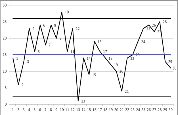 The image displays a control chart, a fundamental tool in statistical process control used to monitor a process’s stability and variation over time. This chart plots 30 sequential data points against a central line and two control limits. The blue central line, positioned at a value of 15, represents the historical average or mean of the process. The two black horizontal lines are the upper control limit (UCL) at approximately 26 and the lower control limit (LCL) at approximately 3. These limits define the expected range of random variation. Any data point falling outside these limits signals a potential issue.