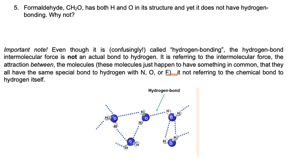 Formaldehyde, CH2O, has both H and O in its structure and yet it does not have hydrogen bonding: Why not? Important note: Even though it is (confusingly) called “hydrogen bonding”, the hydrogen bond intermolecular force is not an actual bond to hydrogen. It is referring to the intermolecular force, the attraction between the molecules (these molecules just happen to have something in common, that they all have the same special bond to hydrogen with N, O, or F). It is not referring to the chemical bond to hydrogen itself.