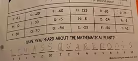 The image displays a classic riddle worksheet that combines mathematics with wordplay. The puzzle asks, “HAVE YOU HEARD ABOUT THE MATHEMATICAL PLANT?” To find the answer, one must solve a series of unlisted math problems. The numerical solution to each problem corresponds to a letter according to the provided key. The student then writes the correct letter in the corresponding blank to spell out the answer.