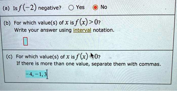 First, let’s look at part (c). It tells us that f(x) = 0 for the x-values -4, -1, and 3. These are the roots, or x-intercepts, of the function. These are the points where the function’s value is neither positive nor negative. These roots divide the number line into four intervals: (-∞, -4), (-4, -1), (-1, 3), and (3, ∞). Within each of these intervals, the sign of f(x) will be consistent, meaning it will be either entirely positive or entirely negative.