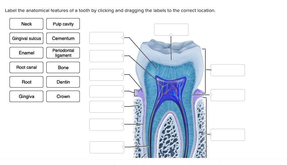 Label the anatomical features of a tooth by clicking and dragging the labels to the correct location. Neck Pulp cavity Gingival sulcus Cementum Enamel Periodontal ligament Root canal Bone Root Dentin Gingiva Crown