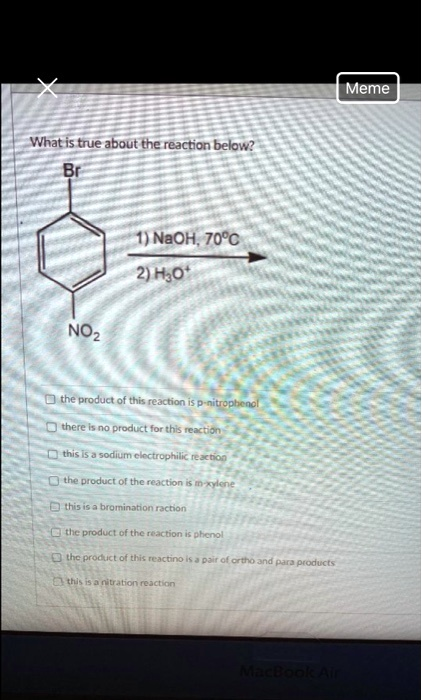 What is true about the reaction below? 1) NaOH; 70°C 2) H2O The product of this reaction is: – None of the above There is no product for this reaction. This is a sodium electrophilic reaction. Produced tetrahydrofuran. None of the above. This is bromination reaction. The product is: The reaction is an elimination reaction. None of the above. Dichloromethane. Ethanol. 3 NO2